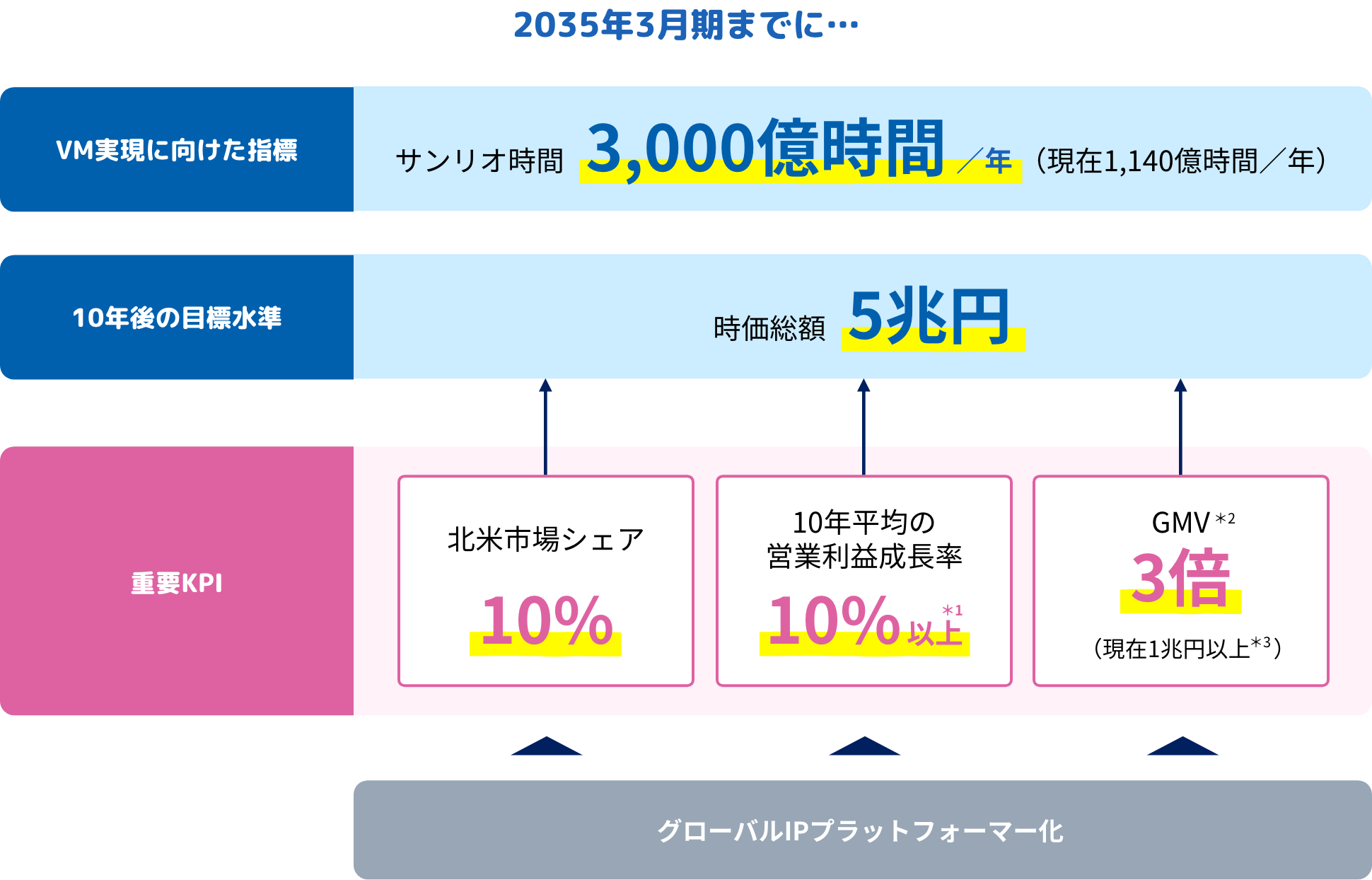 また、当社は2035年3月期までに、時価総額5兆円、10年平均の営業利益率成長10%以上、GMV3倍、北米市場シェア10%、サンリオ時間 3,000億時間/年達成を目標に掲げました。