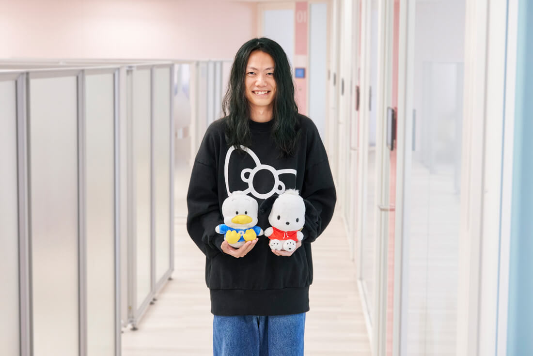 私が小さかった頃から、家にサンリオグッズがあったり、サンリオピューロランドにもよく行ったりするなど、サンリオは非常に身近な存在でした。そして大学生のときには、サンリオピューロランドでのアルバイトをしていました。サンリオは、現会長が社長だった時代に「Small Gift Big Smile」、すなわち、「小さな贈り物によって、笑顔が生まれ、大きな友情を育てる」という合言葉を掲げていました。サンリオピューロランドでの勤務時には、人一倍心を込めてゲストの方(お客様)とコミュニケーションをするように、常日頃から心がけていたのですが、ある日、ゲストの方から、とびっきりの素敵な笑顔で、「お兄さんのおかげでとっても楽しむことができました!」とお礼の言葉をいただいたことがあり、私自身もとても嬉しい気持ちになったのですが、そのときに「Small Gift Big Smile」とはこういうことなんだと心の底から理解できた感覚があったんです。それで、この素敵な言葉を掲げている会社に入りたいとあらためて思うようになりました。就職活動では他社からも内定をいただきましたが、自分が働いている姿をイメージしたときに、一番わくわくしていると思ったのがサンリオでした。