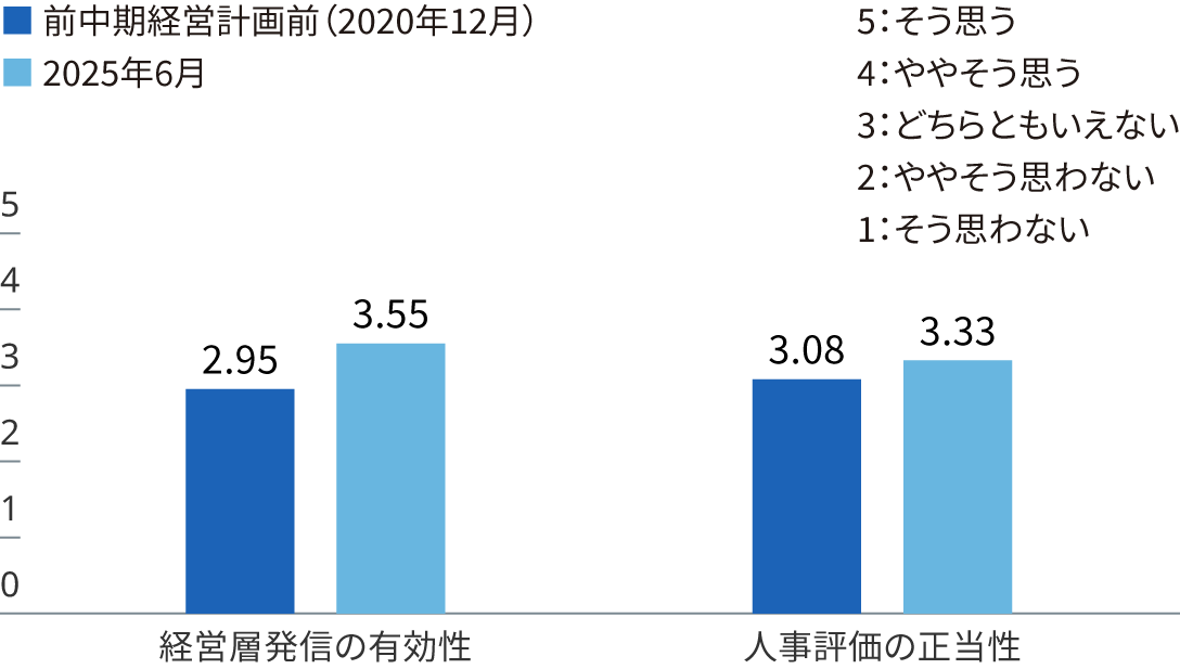 当社グループは、中期経営計画(2025年3月期~2027年3月期)のなかで「グローバルでの成長基盤の構築」を目標の1つに掲げ、働きやすく、チャレンジが認められる企業として成長することをめざしています。その一環として、当社では半期に1回、エンゲージメントサーベイを実施しています。その結果をもとに対話や学習の機会を増やすなど、従業員と会社がともに成長していくための体制を拡充しています。